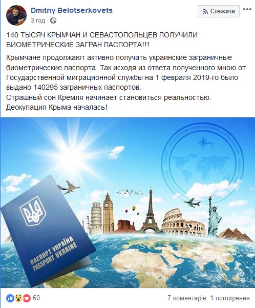 "Крымчане продолжают активно получать украинские заграничные биометрические паспорта. Так исходя из ответа, полученного мною от Государственной миграционной службы на 1 февраля 2019 года, было выдано 140 295 заграничных паспортов. Страшный сон Кремля начинает становиться реальностью. Деокупация Крыма началась", – отметил политик.