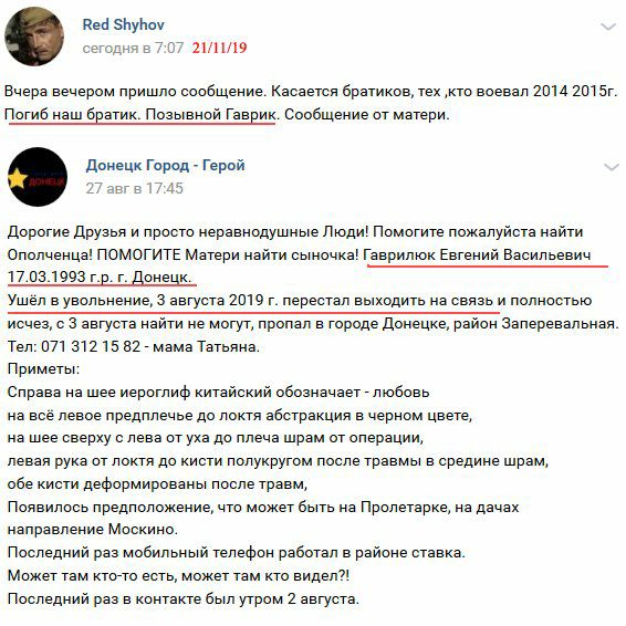Блогер опубликовал скриншоты из социальных сетей, в которых знакомые боевика пишут о его гибели. Как отмечается, Гаврилюк ушел в увольнение еще 3 августа 2019 года, однако о его гибели стало известно не так давно. Пропал он в Донецке, подробности гибели боевика не уточняются.