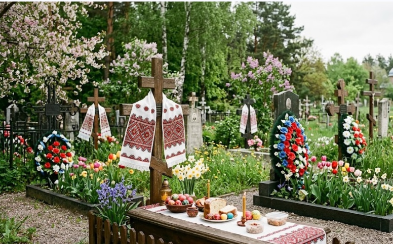 Сохранилась традиция приносить пасхальные блюда – пасхи, пасхальные яйца – как символ радости Воскресения. Часть пищи раздают нуждающимся как поминальную милостыню. Семья часто собирается вместе после посещения кладбища, чтобы в спокойной атмосфере вспомнить близких.