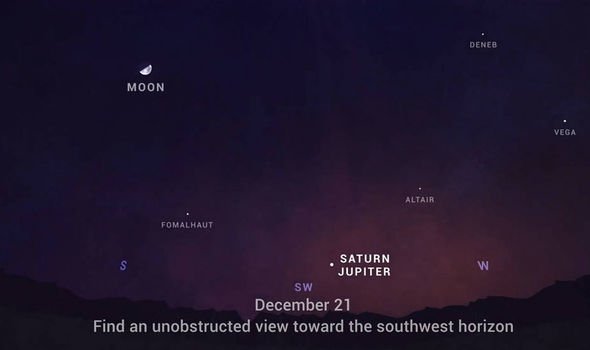 2. Явление будет заметно через час после захода солнца в юго-западной части неба. Юпитер будет выглядеть как яркая звезда и будет легко заметен. Сатурн будет немного слабее и появится чуть выше и левее Юпитера до 21 декабря, а после этой даты Юпитер догонит его и они поменяются положениями на небе.