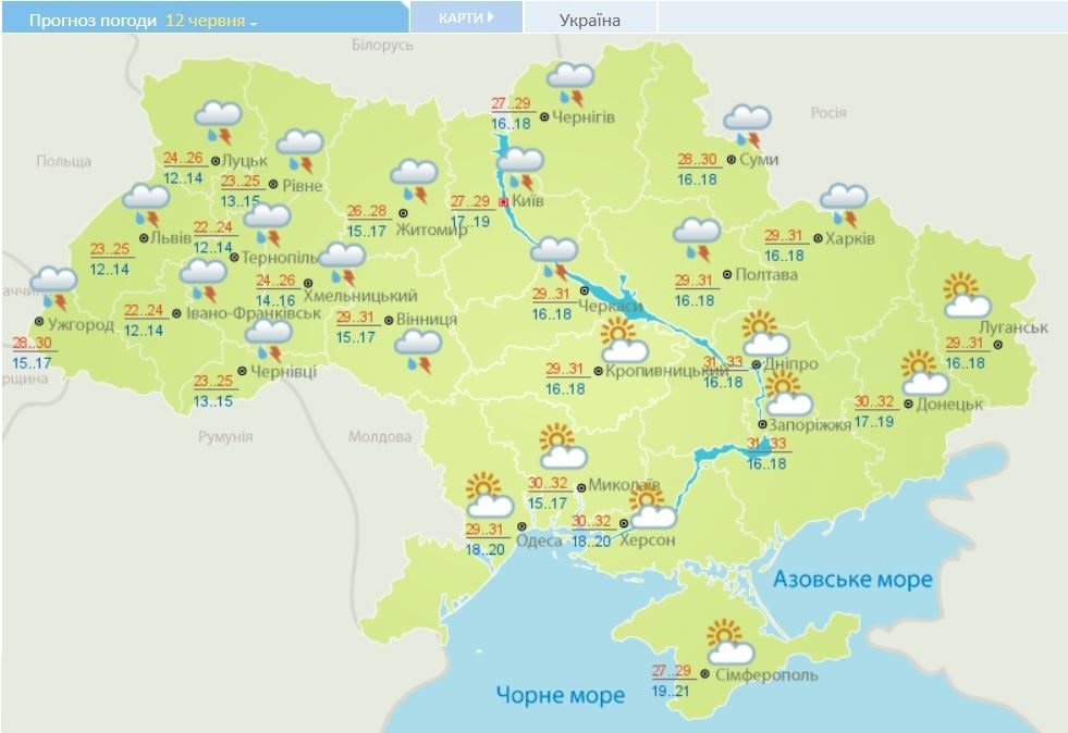 В понедельник на большей части Украины будет облачно с прояснениями, однако дожди с грозами ожидаются в центральных, южных и части восточных регионов. На западе ночью прохладно – от +12 до +16 градусов, но днем прогнозируется комфортная температура +25+28 градусов. В то же время на остальных территориях ночью +14+20, а дневная температура от +27 до +31 градуса.