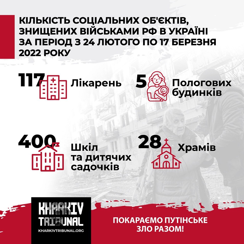 В частности, по данным "Нюрнберг 2022", с 24 февраля по 17 марта 2022 года из-за российских обстрелов и бомбовых ударов разрушены 117 больниц и 5 роддомов. Повреждены или полностью уничтожены 400 школ и детских садов. Пострадали 28 храмов, большинство из которых – КПЦ Московского патриархата.