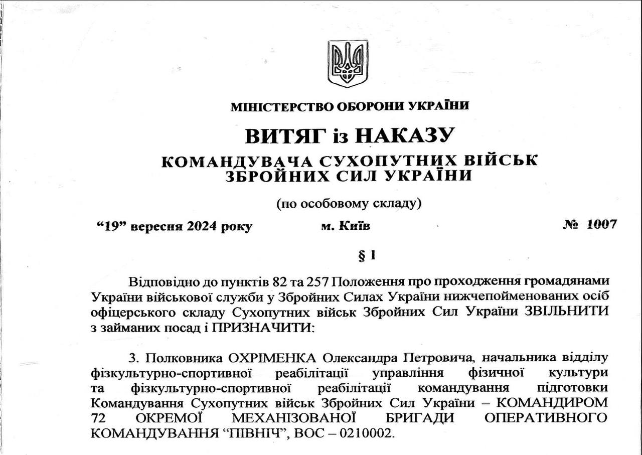 Так, в приказе Минобороны от 19 сентября, который выложила в своем Telegram-канале Безуглая, говорится, что полковник Охрименко займет место командира бригады.