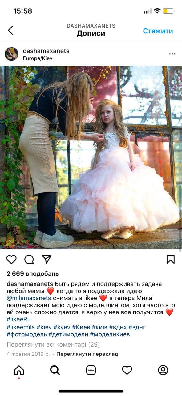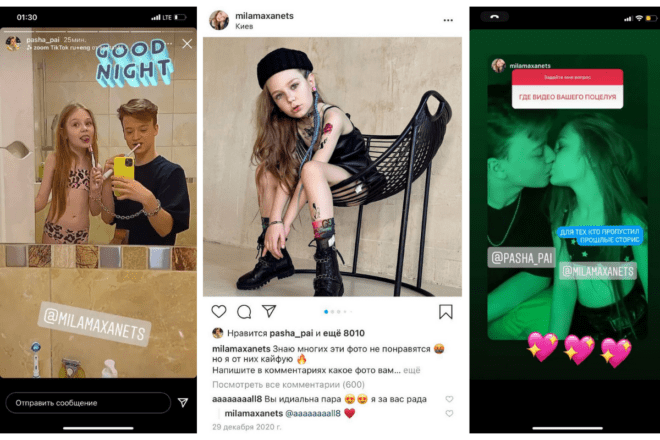 "8-летняя киевская модель начала встречаться с 13-летним Insta-блогером. Они активно публикуют Сторис, где постоянно целуются, девочка позирует на фото в откровенной взрослой одежде, а ее мама это все дело продюссирует, зарабатывая деньги", - говорится в публикации .