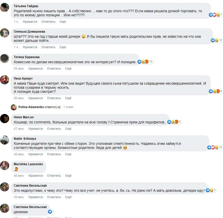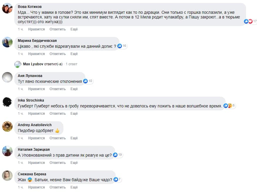 "Мне жаль этих детей, рабы соцсетей", "Ужас ...",то мамины нереализованные амбиции. Бедный ребенок", "Какой батя - такой сын, который мама такая и дочь", "Это ужасно! Неужели родители этому потакают? Девочка нравится парню - это норм. Мимишные отношения - это норм. Но должен быть предел. Где заканчивается мимишность и начинается пошлость и развращение", "Привлечь тех родителей с обеих сторон этой чудо пары к ответственности! "," Интересно, какие службы отреагировали на данное сообщение?", "Ужас просто какой-то. Люди добрые, опомнитесь ... что вы делаете? Зачем так портите детям жизнь?", - написали украинцы в комментариях под сообщением.