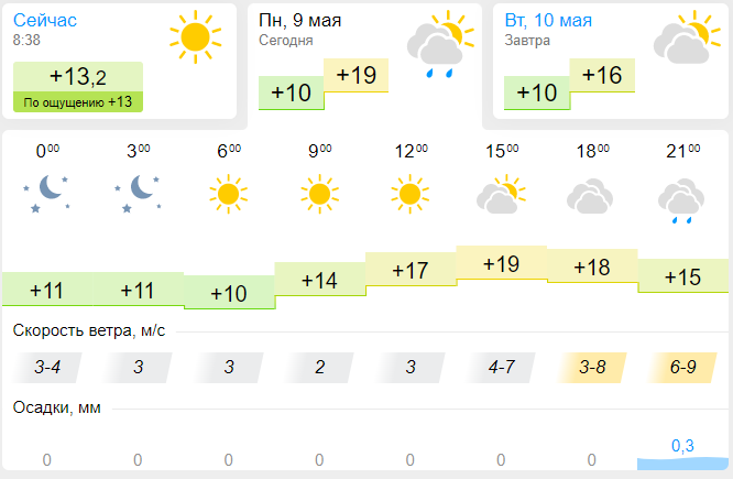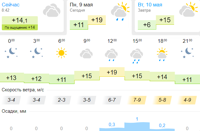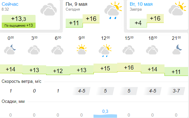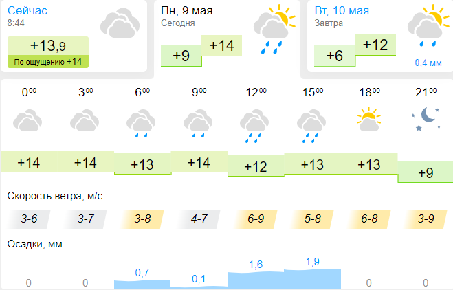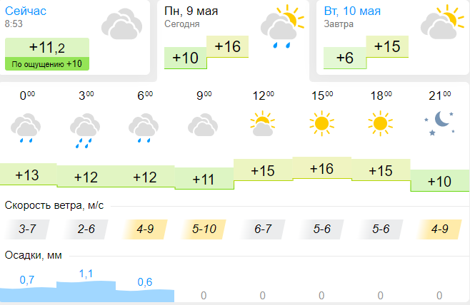 В Киеве 9 мая незначительный дождь прогнозируется на ранее утро, позднее он прекратится, выйдет солнце. В дневные часы воздух прогреется до 16 градусов тепла.