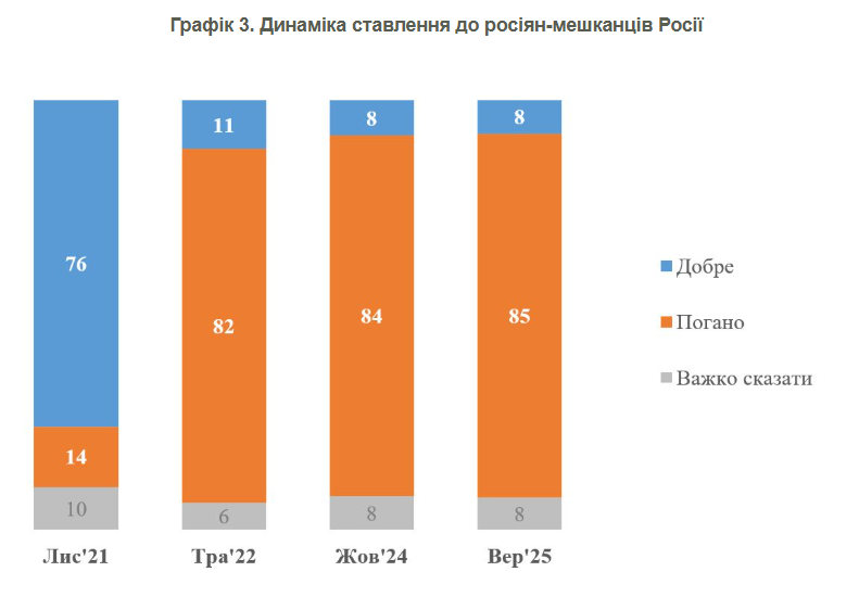 Отношение к россиянам – жителям России также остается критическим: "только 8% украинцев хорошо относятся к россиянам-жителям России, а 85%, наоборот, относятся к ним плохо". Эти показатели также почти идентичны показателям за 2024 год.