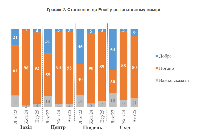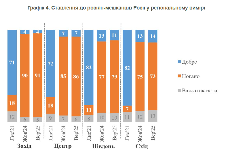 Анализ изменений между ноябрем 2021 года и сентябрем 2025 года показывает: по состоянию на сентябрь 2025 года абсолютное большинство украинского населения во всех регионах – от 91% на Западе до 73% на Востоке – выражает негативное отношение к россиянам, проживающим в России. При этом количество тех, кто хорошо к ним относится, остается низким, достигая максимум 14% (на Востоке).