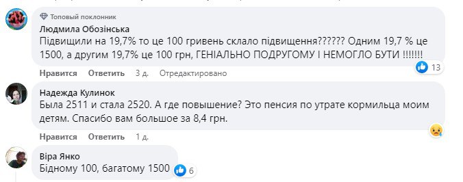 Их очень возмущает то что у пожилых людей с большой пенсией прибавка большая, а некоторым добавили совсем мало - кому-то 1 500 гривен, а кому-то - 100.