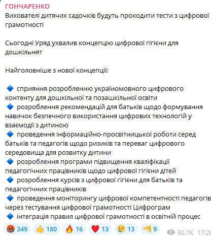 Он отметил, что правительство приняло концепцию "цифровой гигиены для малышей" в учреждениях дошкольного и внешкольного образования. В ее рамках воспитатели детских садов будут проходить тесты по цифровой грамотности, а родители получат ориентиры по воспитанию детей в условиях цифровизации.