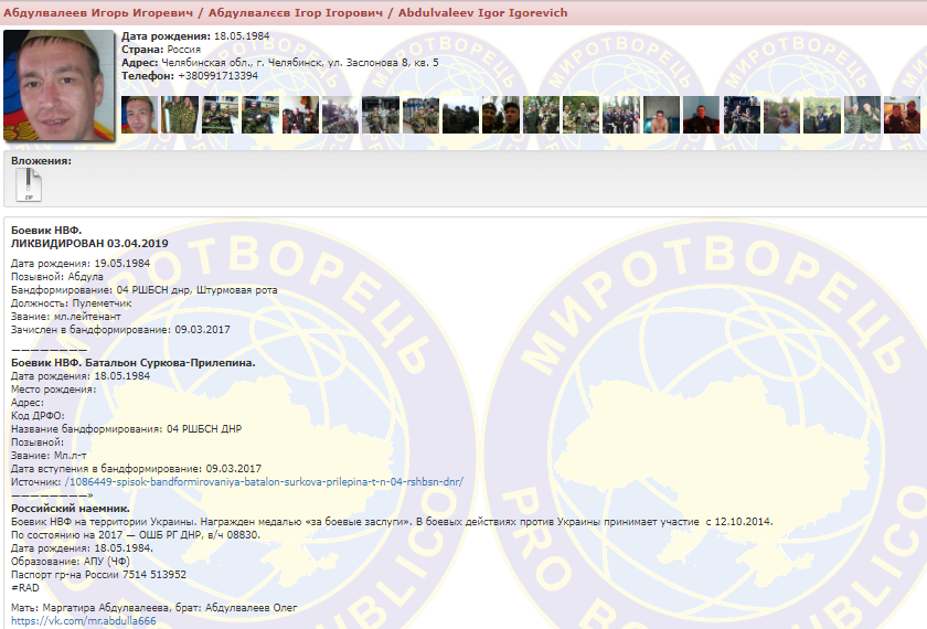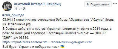 "200_бригада 03.04.19 пополнилась очередным бойцом Абдулвалеев "Абдула" Игорь из Челябинска рф. В боевых действиях против Украины принимал участие с 2014 года, в боях за Донецкий аэропорт, настоящий момент "мл.л-т" - ОШБ РГ "ДНР", в/ч 08830", - говорится в сообщении.
