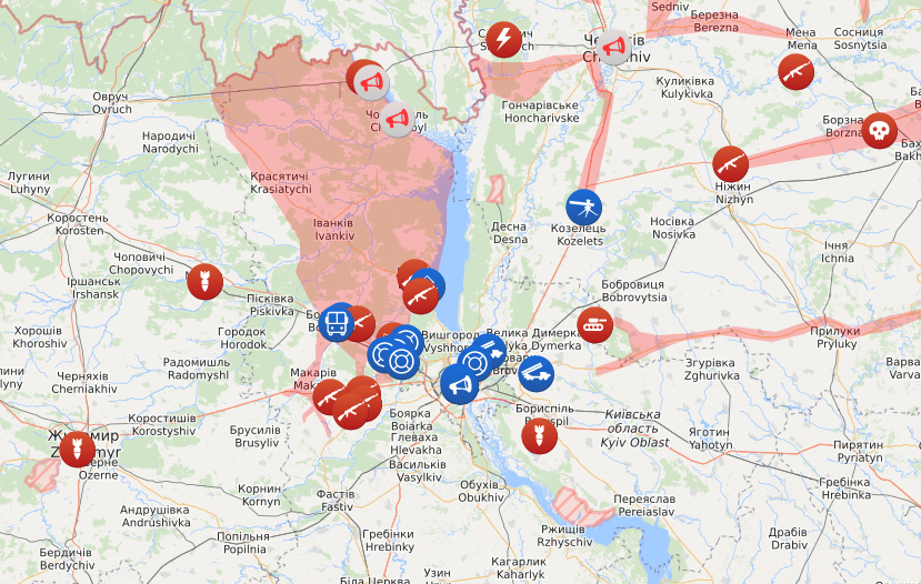 Есть отметка о затопленных землях севернее Киева, которые остановили продвижение российских войск на столицу.