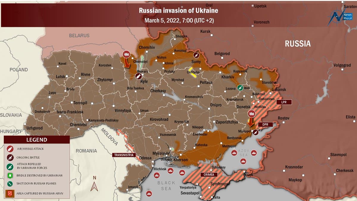 Об этом свидетельствуют актуальные данные карты вторжений на 5 марта NewsMap.pl.