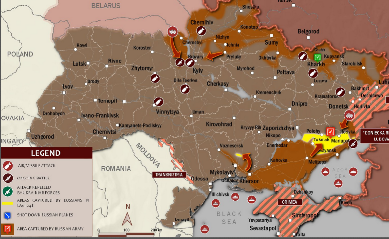 В Запорожской области продолжалось мощное сопротивление российскому вторжению. Бои идут возле населенных пунктов Гуляйполе, Орехов и в направлении Васильевка-Балабино. Вражеским войскам удалось оккупировать населенные пункты Пологи, Васильевка и Токмак. Запорожская АЭС – в дальнейшем под контролем РФ.