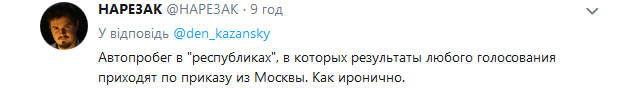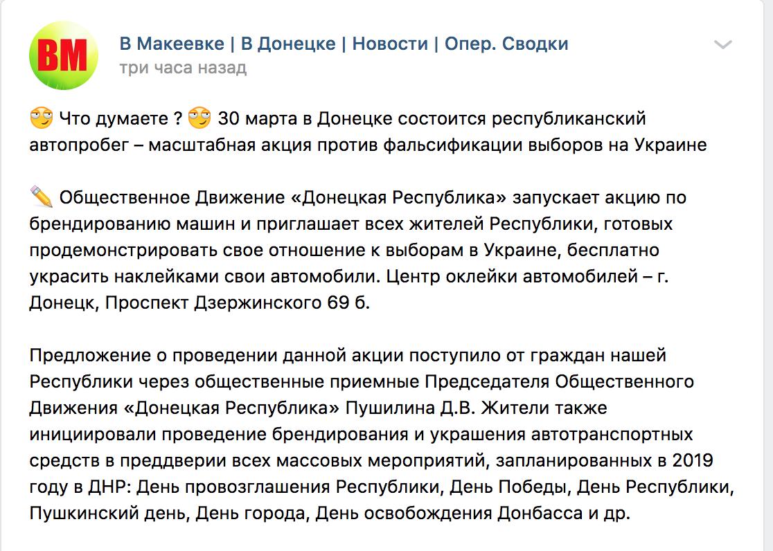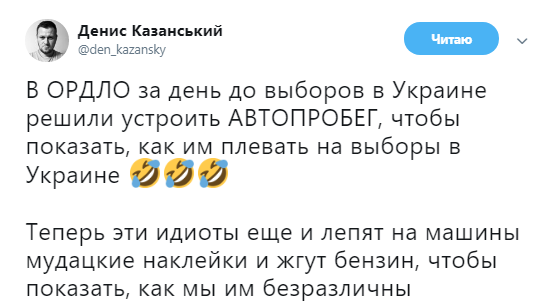 "В ОРДЛО за день до выборов в Украине решили устроить АВТОПРОБЕГ, чтобы показать, как им плевать на выборы в Украине. Теперь эти идиоты еще и лепят на машины мудацкие наклейки и жгут бензин, чтобы показать, как мы им безразличны", - говорится в сообщении.
