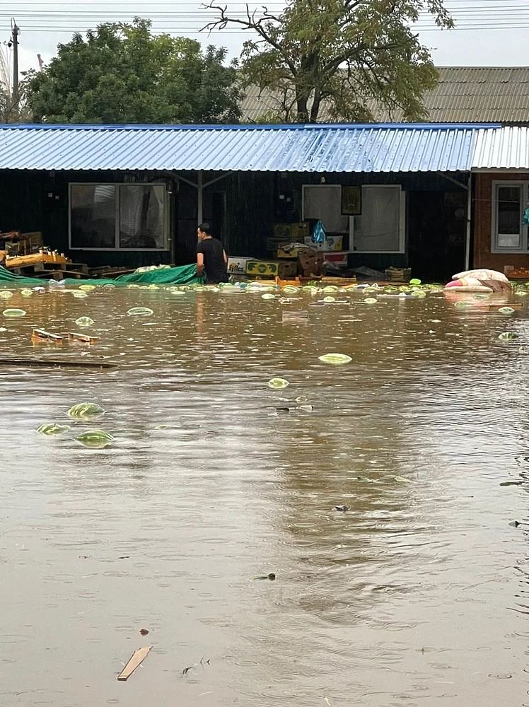 Так как затопило рынок, на видео местных жителей видно, что по улицам плавают арбузы, дыни и овощи.