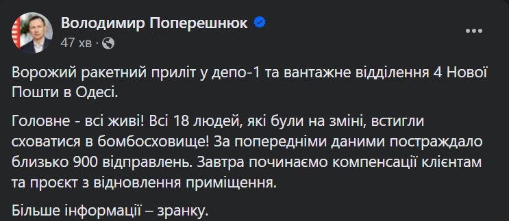 Враг ударил ракетами по сортировочному депо и отделению "Новой почты", погибших и раненых удалось избежать. Руководство НП заявило, что возместит в полном объеме оценочную стоимость посылок, которые были уничтожены во время обстрела.
