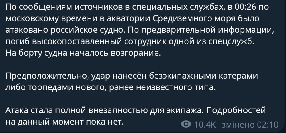 Информационное пространство всколыхнули сообщения о вероятной атаке на судно «теневого флота» России в водах Средиземного моря. Согласно данным, активно распространяемым в социальных сетях, нападение могло быть осуществлено с применением инновационных морских дронов. Особое внимание приковано к заявлениям о пребывании на борту высокопоставленных сотрудников российской разведки.