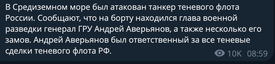 Согласно сообщениям отдельных российских источников, во время атаки на танкер якобы двое погибших и семеро раненых. Наиболее резонансной является информация о возможной ликвидации генерала ГРУ Андрея Аверьянова – одной из ключевых фигур в системе диверсионных операций Кремля. Аверьянову приписывают ответственность за отравление Скрипаля в Великобритании, организацию взрывов на складах в странах ЕС и причастность к уничтожению самолета Евгения Пригожина. На борту танкера он мог заниматься кураторством теневых сделок и шпионской сети.
