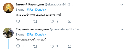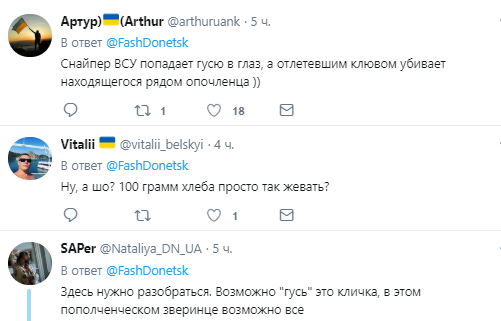 "Когда обсуждение новых зверств карателей у кисилева?", "мид эрэф уже сделал заявление?", "Геноцид гусей, чишо?", "Снайпер ВСУ попадает гусю в глаз, а отлетевшим клювом убивает находящегося рядом опочленца", "Ну, а шо? 100 грамм хлеба просто так жевать?", "Здесь нужно разобраться. Возможно "гусь" это кличка, в этом пополченческом зверинце возможно все", - в таком духе комментируют пользователи сети.