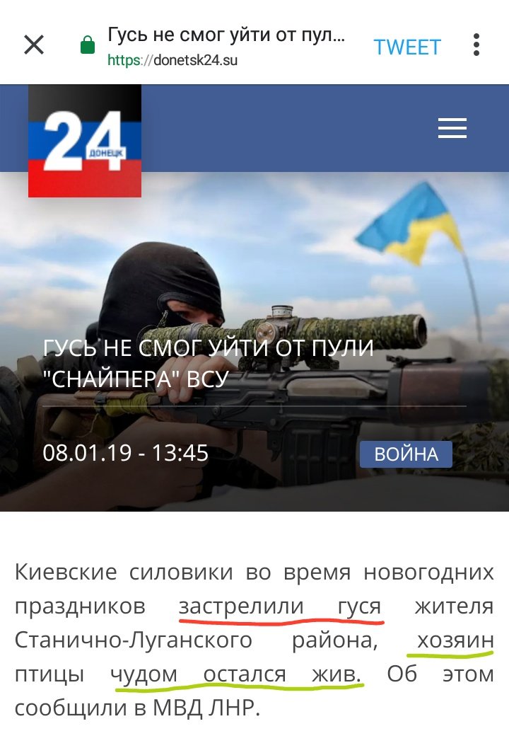 "Киевские силовики во время новогодних праздников застрелили гуся жителя Станично-Луганского района, хозяин птицы чудом остался жив", - рассказали пропагандистские СМИ.