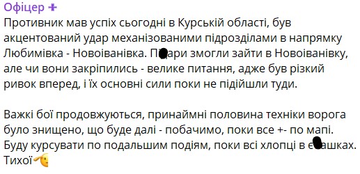 "В Курской области отбито утраченное. Без деталей. Тигры", - написал военный.