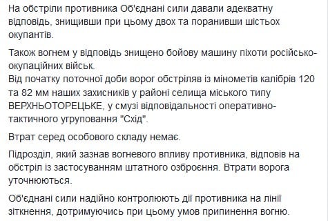 В свою очередь бойцы ООС нанесли мощный удар в ответ на провокации боевиков. По данным военной разведки, в результате этого были ликвидированы двое боевиков. Еще шестеро бойцов врага получили ранения.