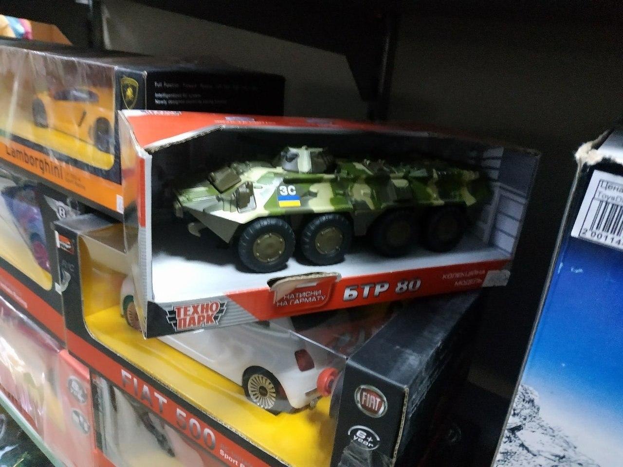Так, в продаже тут имеются БТР и зенитная установка, на которых нанесена символика Украины. Интересно, что надписи на упаковках также сделаны на украинском языке.