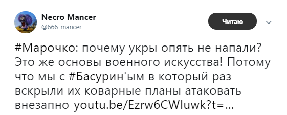 "Марочко: почему укры опять не напали? Это же основы военного искусства! Потому что мы с Басурин'ым в который раз вскрыли их коварные планы атаковать внезапно", - говорится в сообщении.
