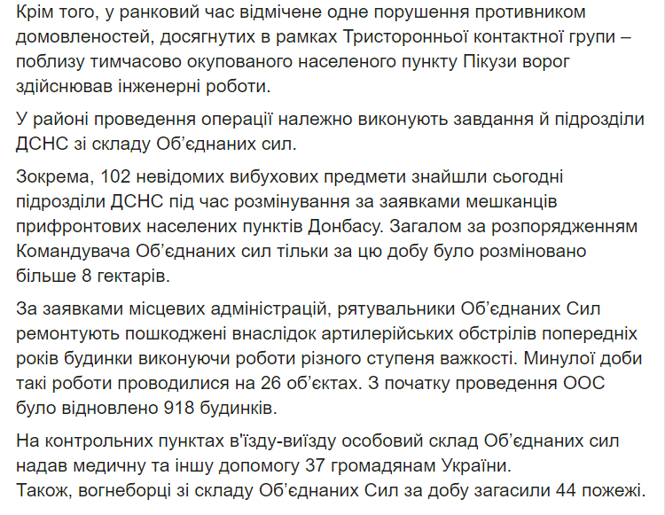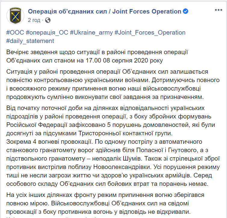 Отмечается, что все случаи нарушения перемирия не угрожали жизни или здоровью украинских военнослужащих. Боевых потерь и ранений среди личного состава нет.