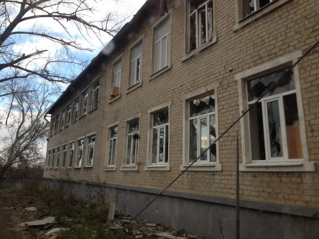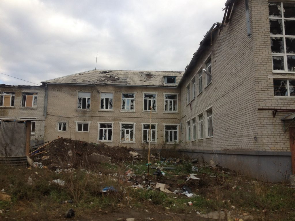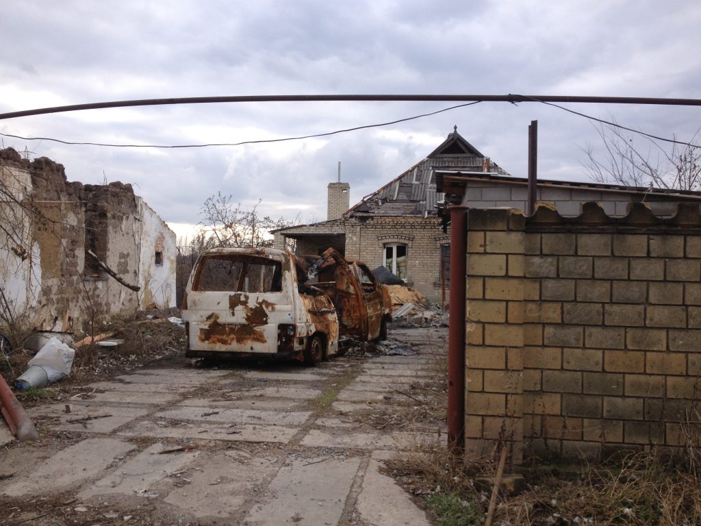 В то же время, примерно в 500 метрах от центра, на окраине города царит полная разруха: разрушенные снарядами дома с квартирами, здание интерната.