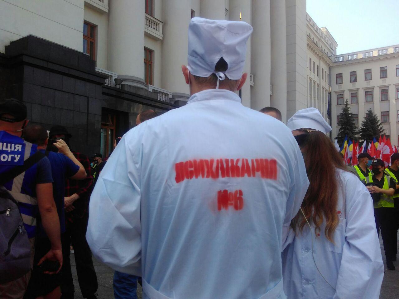 Под здание Офиса президента пришли люди в белых халатах с табличкой "Психиатрическая помощь. Лечим Шизария".