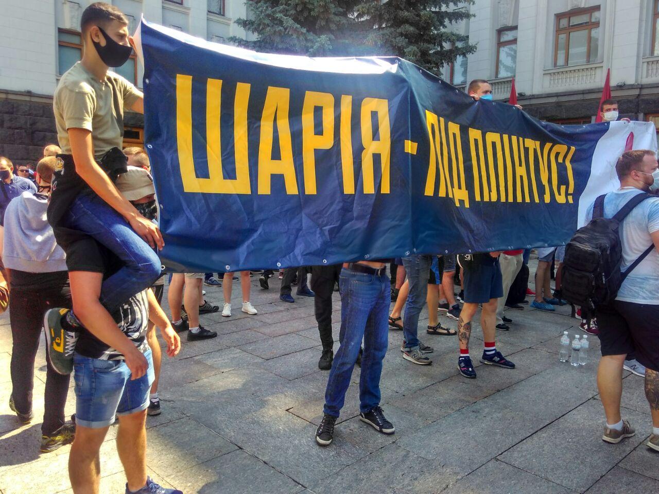 Это представители праворадикальных организаций, которые "готовы предоставить психиатрическую помощь сторонникам Шария". Среди них - Евгений Карась, лидер ультраправых по организации С14. Полиция участников акций к самому зданию Офиса президента не пускает.
