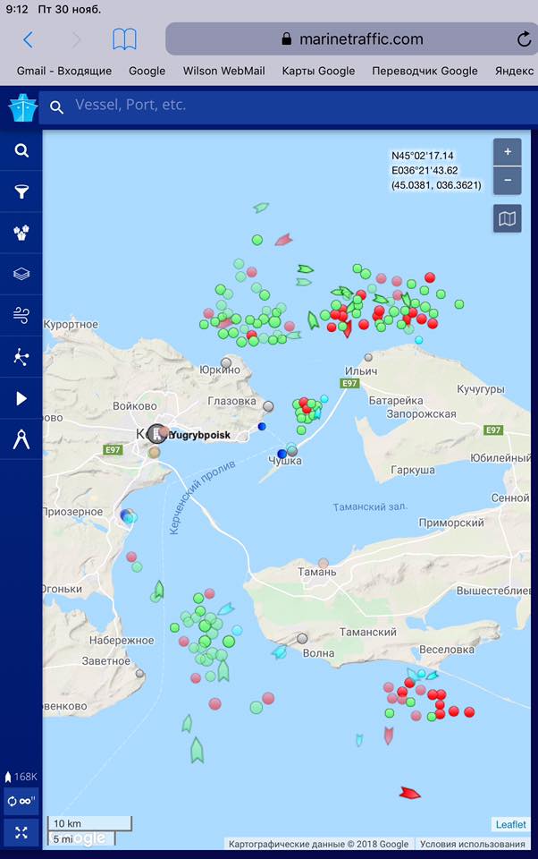 Напомним, в период с 25 по 27 ноября количество кораблей в Керченском проливе и вблизи него увеличилось более чем в 2,5 раза – с 167 до 421 корабля.