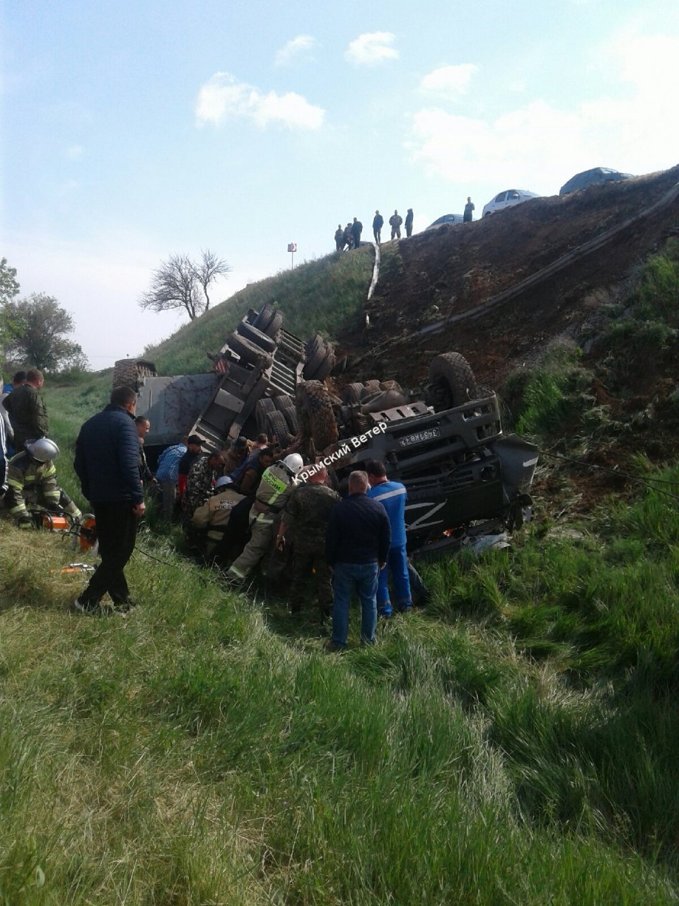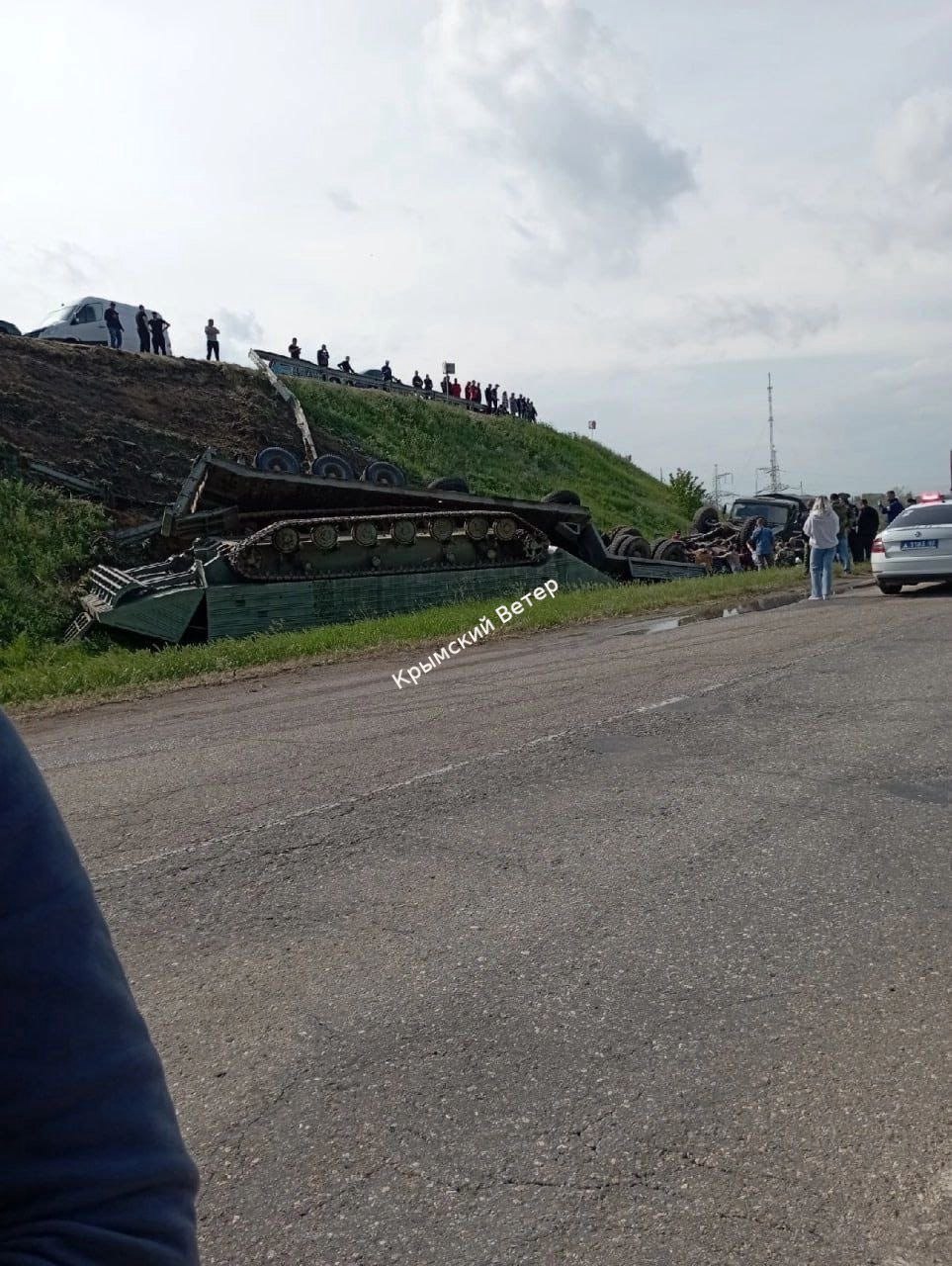 Трал перевозил танк, который перевернулся вместе с ним. Во время инцидента пострадали двое военнослужащих, они находятся в тяжелом состоянии.