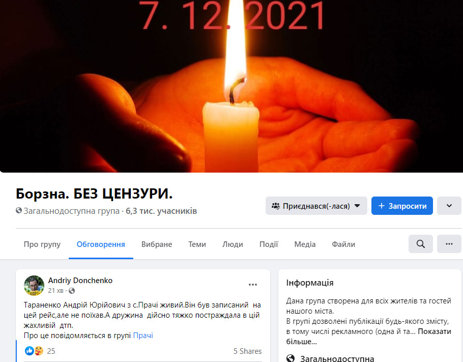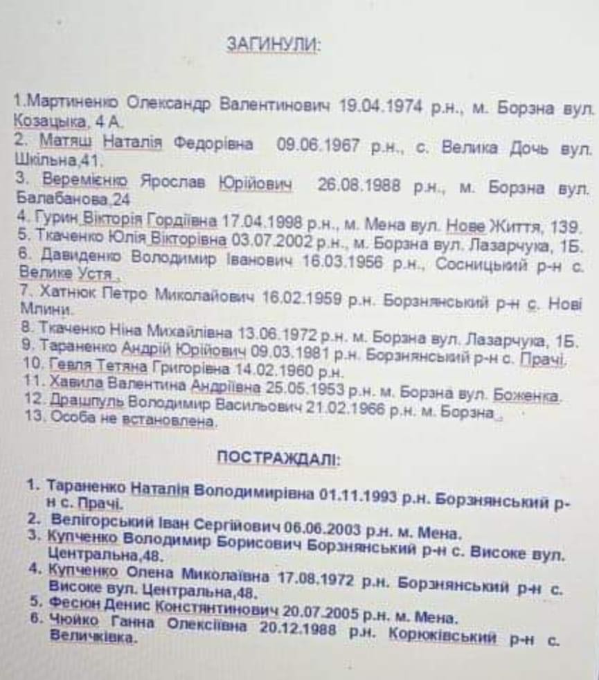 Отмечается, что его источник - главный специалист по информационной деятельности Плисковского сельского совета Наталья Демусенко. Однако официального списка погибших и пострадавших пока нет. Также в социальных сетях сообщается, что Андрей Тараненко из села Прачи - жив.