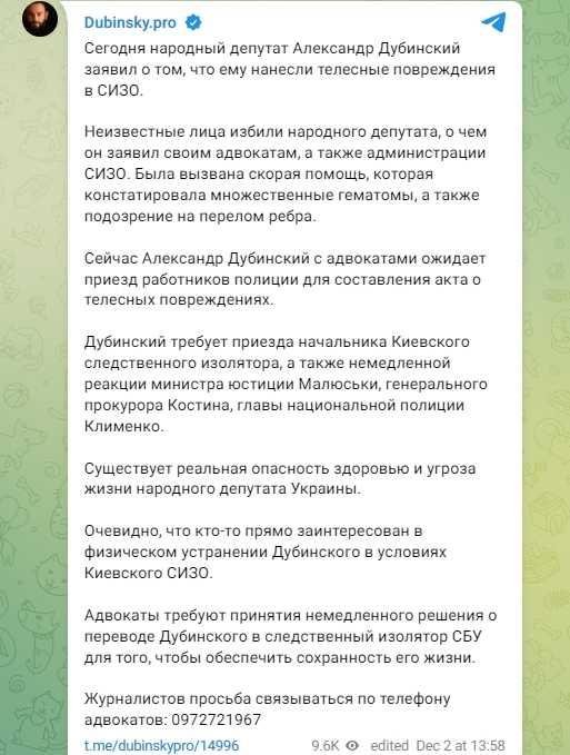 Сейчас Александр Дубинский с адвокатами ожидает приезд работников полиции для составления акта о телесных повреждениях. Он требует приезда начальника Киевского следственного изолятора, а также немедленной реакции министра юстиции Малюськи, генерального прокурора Костина, главы национальной полиции Клименко.