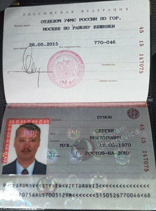 В соцсетях также опубликовали информацию о том, что Игорь Стрелков-Гиркин въехал в оккупированный Крым по поддельному паспорту, который был выдан на имя Сергея Рунова. Не исключено, что этими документами экс-полковник ФСБ пользовался во время работы в спецслужбах России.