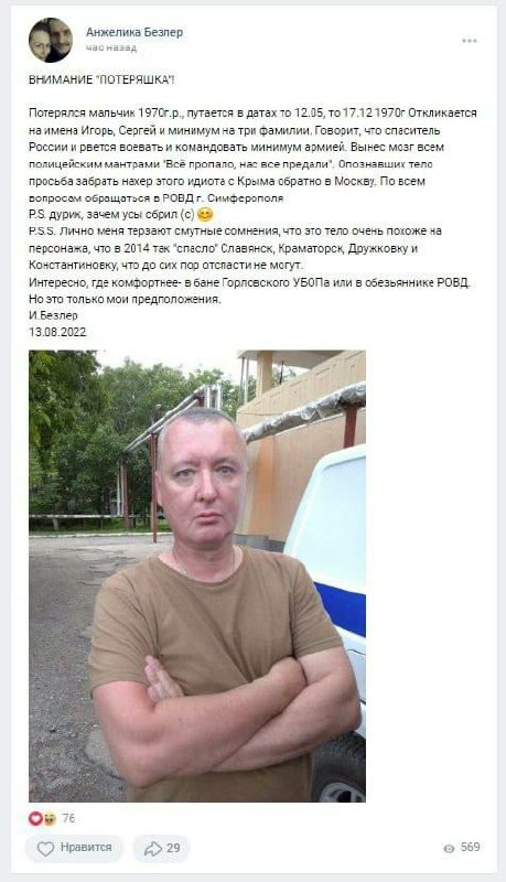 "Дурик, зачем усы сбрил?", - говорится в подписи к фотографии, которая якобы была сделана в Крыму после задержания Стрелкова-Гиркина.