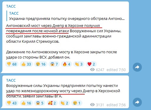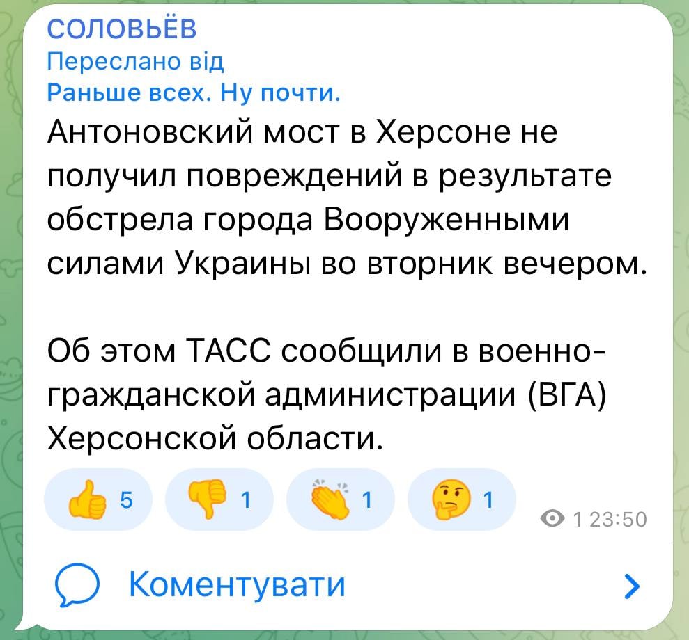 В то же время, пропагандистские СМИ и сами пропагандисты страны-террориста РФ не могут определиться, что же произошло с Антоновским мостом. В росСМИ признают повреждение моста и добавляют, что ВСУ били и по железнодорожному мосту с аналогичным названием. В то время как пропагандисты пишут, что Антоновский мост якобы остался целым. Снова не согласовали методички.
