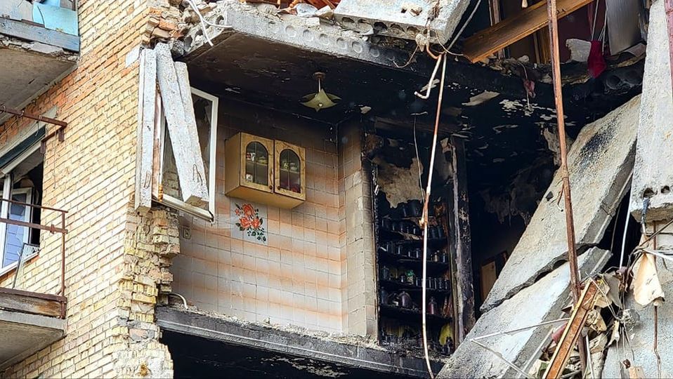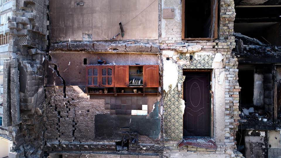 В селе Горенка Бучанского района Киевской области, которое было практически уничтожено российскими оккупантами, как символ стойкости, на стене разрушенного дома уцелел кухонный шкафчик с консервацией.