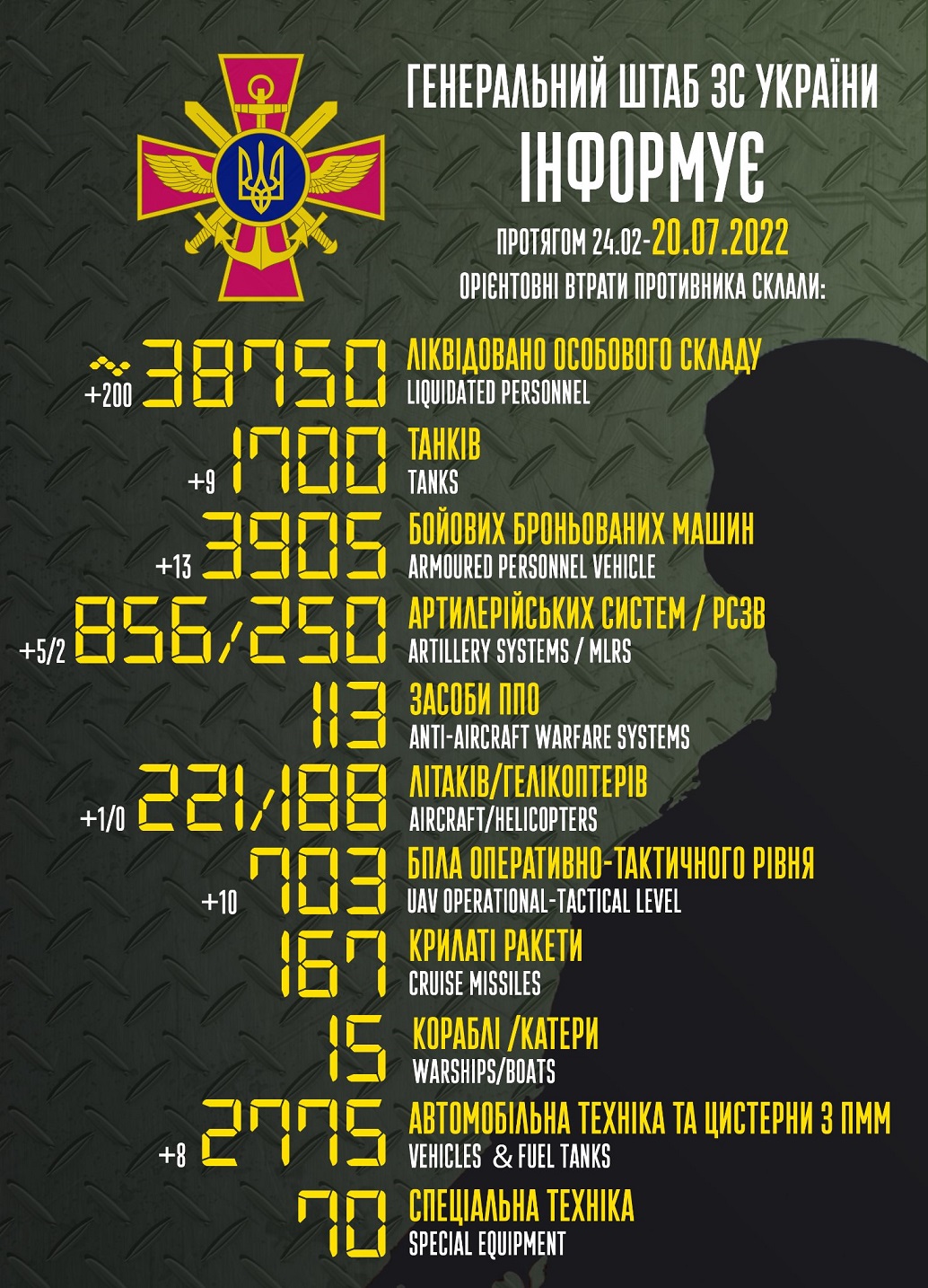 Так, общие боевые потери противника с 24.02 по 20.07 ориентировочно составили: