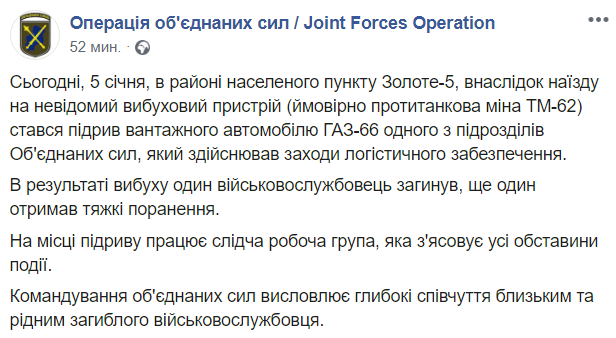 Вероятно, об этом же инциденте и подрыве военных ВСУ на мине 4 января рассказал журналист Юрий Бутусов на своей странице в Facebook.