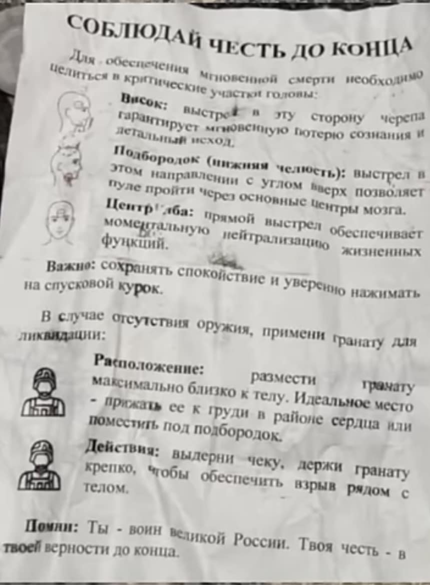 Солдатам российских оккупационных войск, воюющих в Украине, командование выдает памятки, как правильно совершать самоубийства.