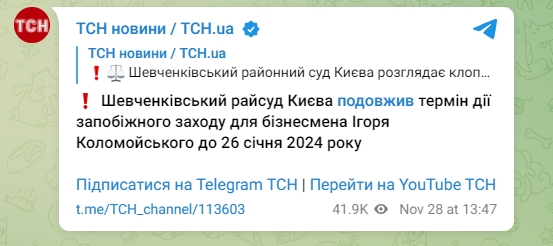 Отмечается, что суд постановил удовлетворить ходатайство детективов Бюро экономической безопасности Украины и продлить срок содержания под стражей для Коломойского Игоря Валерьевича в пределах срока досудебного расследования до 26 января 2024 года включительно, и установить подозреваемому залог в 3 миллиарда 712 тысяч гривен. Также указано, что сторона защиты может подать апелляцию на это решение.