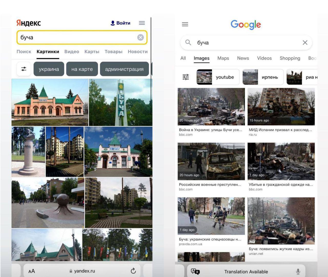 Российская поисковая система "Яндекс" по запросам "Буча", показывает фото города, сделанные до вторжения в Украину оккупантов, в то время как Google выдает последнюю информацию с ужасными кадрами Бучанской резни.