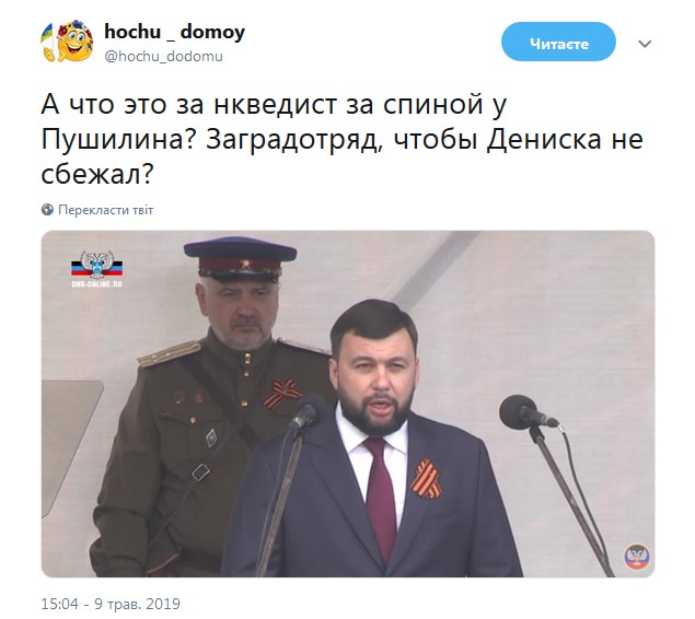"А что это за нкведист за спиной у Пушилина? Заградотряд, чтобы Дениска не сбежал?" - написал он.