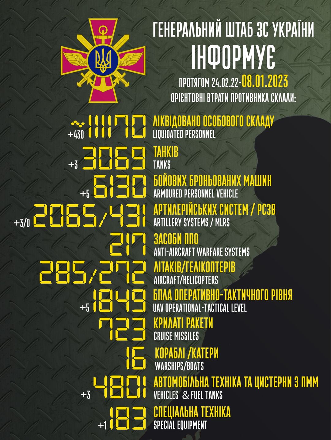 Об общих боевых потерях врага по состоянию на 8 января сообщили в Генштабе ВСУ.