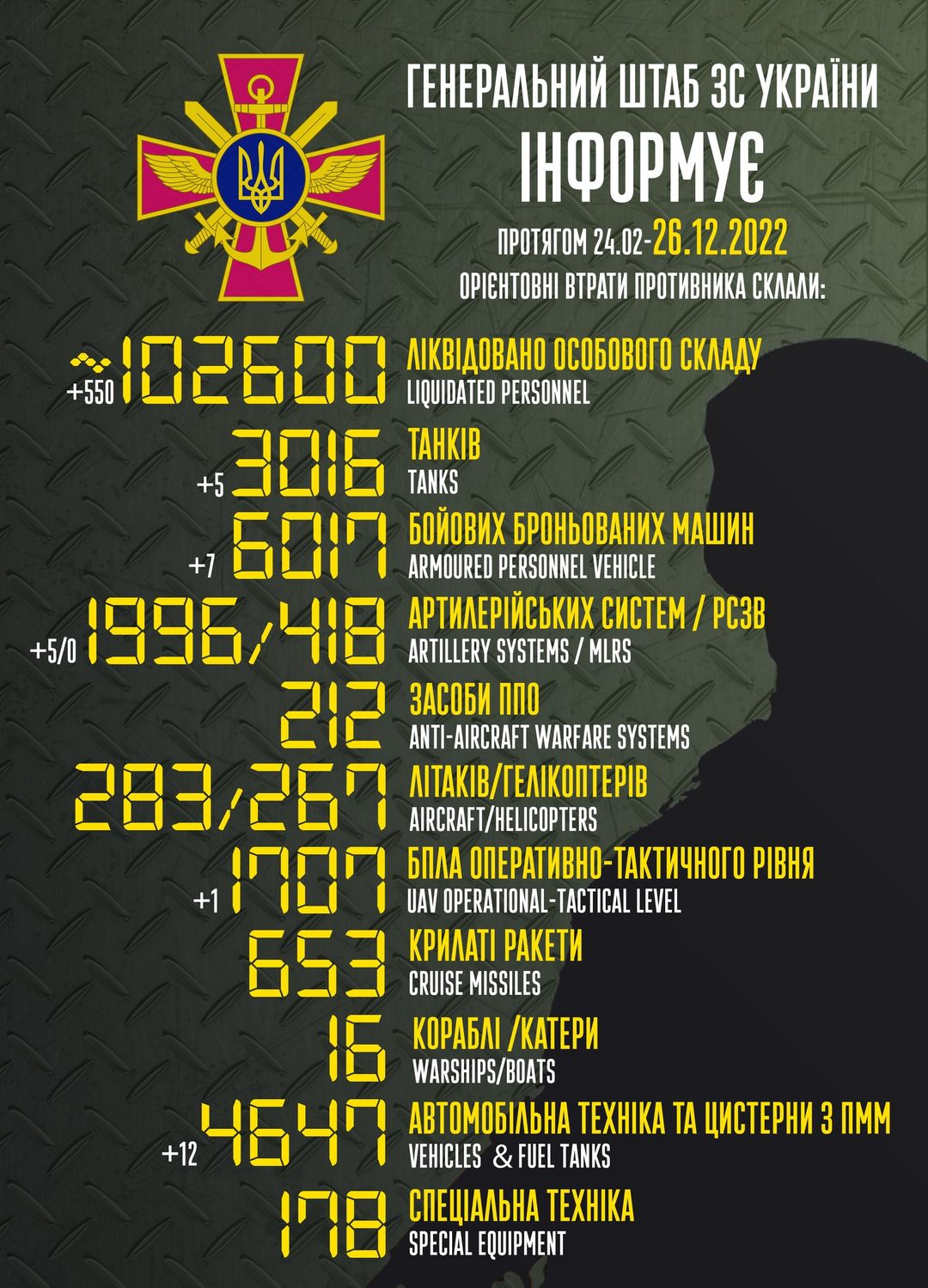 Об общих боевых потерях противника по состоянию на 26 декабря сообщили в Генштабе ВСУ.