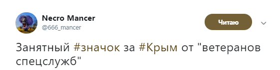 "Занятный значок за Крым от "ветеранов спецслужб"", - подписал он фото.